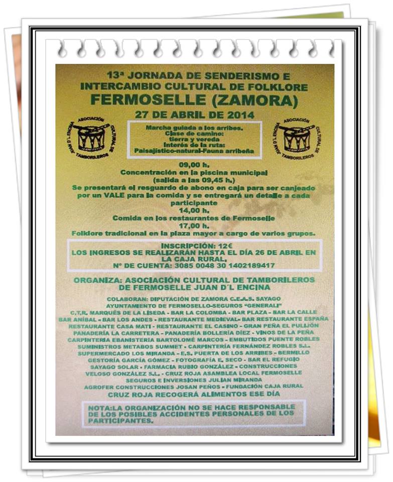 El pasado 27 de abril se celebró en Fermoselle la decimotercera jornada de senderismo. El numeroso público asistente se congregó en la piscina municipal para iniciar una marcha guiada por caminos de tierra y vereda en los Arribes. Tras el paseo, se celebró una comida y, a las 17:00 horas, una muestra de folclore. Se finalizó la jornada con los sones de los tambores y la trompeta de Luis Pedraza en la Peña El Pulijón.
