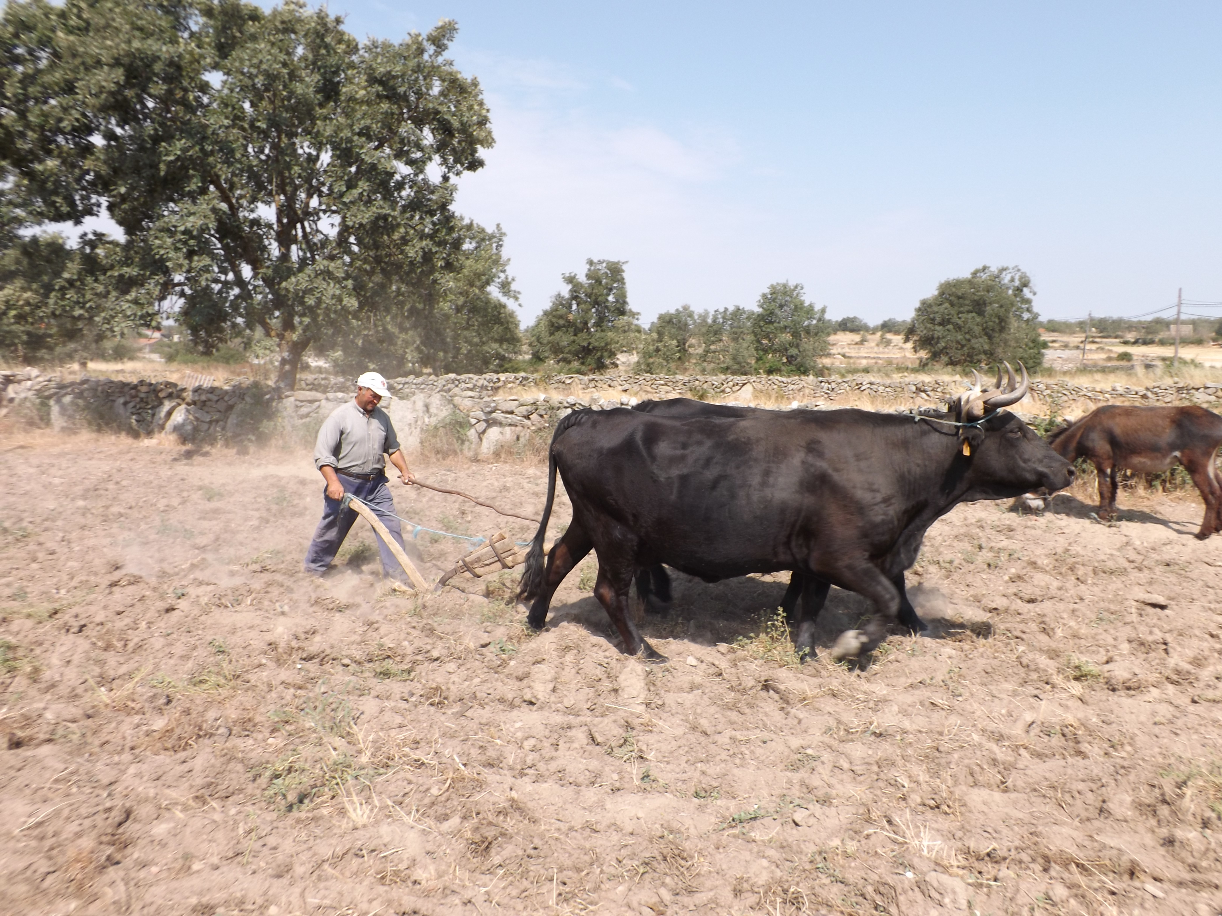 Ejemplares de vaca sayaguesa arando la tierra
