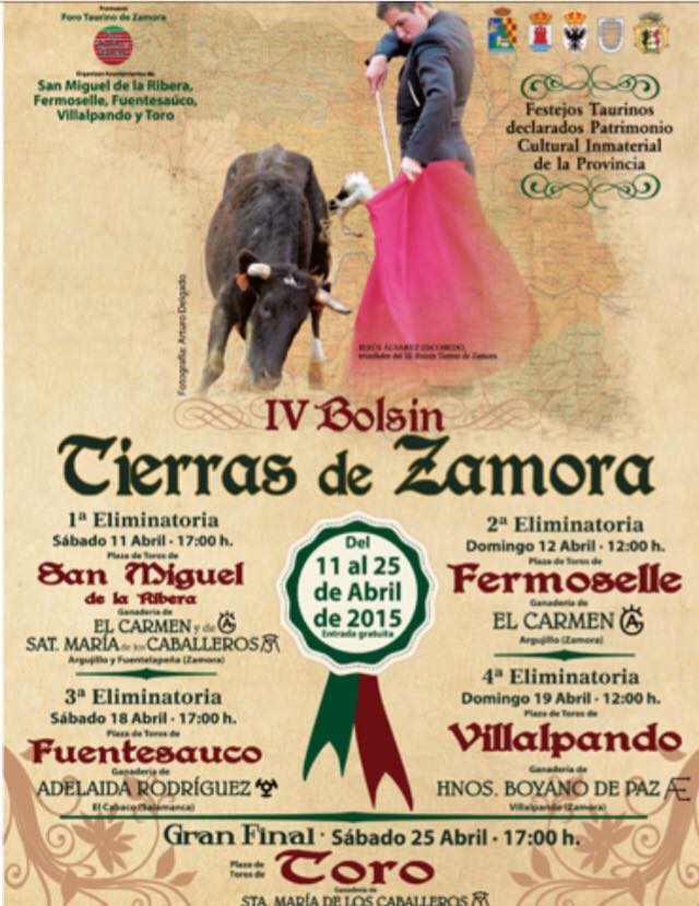 Durante el mes de Abril, se celebra en varios pueblos de Zamora el IV Bolsín Taurino de la provincia. Se trata de un evento taurino que reúne jóvenes toreros que buscan una oportunidad. El domingo 12 de abril, a las 12 horas, se celebrará en Fermoselle la segunda eliminatoria con toros de la ganadería El Carmen de Argujillo. El resto de eliminatorias se celebra en San Miguel de la Ribera, Fuentesauco y Villalpando, de la que saldrán los elegidos para disputar la gran final en Toro, el 25 de abril. Estos festejos están apoyados por el foro taurino de Zamora y los ayuntamientos de todas las localidades participantes. Damos las gracias a Maite Puente por hacernos llegar esta información a través del grupo de facebook Imágenes de Sayago.