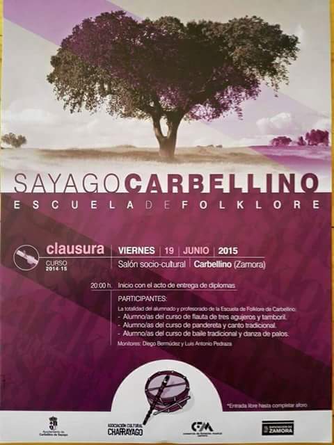 Hoy viernes 19 de Junio a las 20 horas la Escuela de Folklore de Carbellino celebra la clausura del curso 2014-2015. Comenzará el acto con la entrega de diplomas para, posteriormente, disfrutar de las actuaciones de los alumnos y alumnas de los cursos de flauta y tamboril ,pandereta y canto tradicional y baile tradicional y danza de palos. La escuela de folklore lucha por la pervivencia de la tradición musical de la Comarca de Sayago y cuenta con el apoyo del Ayuntamiento de Carbellino, la Diputación de Zamora, la Asociación Cultural Charrayago y el Consorcio de Fomento Musical.