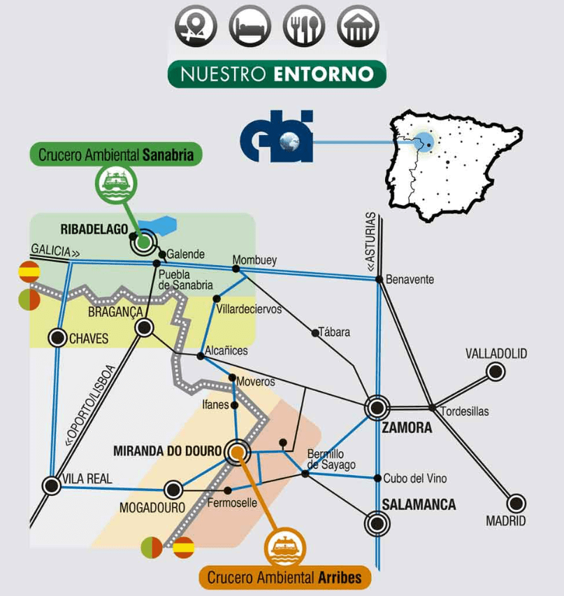 En la frontera entre Zamora y Portugal, a pocos metros de la presa de Miranda, los turistas y visitantes pueden surcar las aguas del Duero embalsado a bordo del barco ecológico de la empresa Europarques. El recorrido se ameniza con las explicaciones de guías y un audio que va detallando los recursos de la zona. Así, en los distintos puntos se pueden ver cultivos en bancales, avistar cigüeñas negras, visitar «El pozo de las nutrias«, casetos de piedra y, como no, conocer la belleza natural de las enormes paredes de piedra del Arribe.