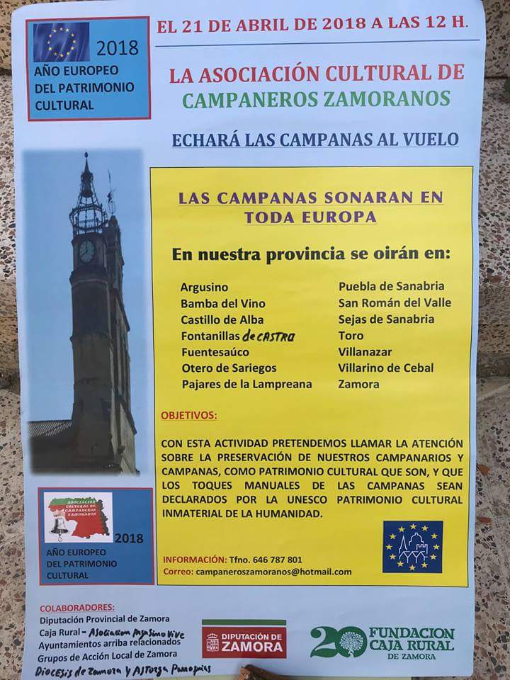 Los campaneros de Zamora harán sonar las campanas de varios templos para reivindicar ante la UNESCO la inclusión de esta tradición como Patrimonio Inmaterial de la Humanidad. En Sayago, tañerán las campanas de Argusino. Colaboran en este acto la diputación de Zamora, Caja Rural, Ayuntamientos, Grupos de Acción Local de Zamora y la Diócesis de Zamora y Astorga junto con las diferentes parroquias.