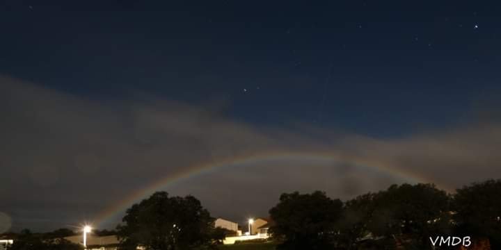 Arcoiris a la luz de la luna, hace un rato. Las tres estrellas casi juntas del centro de la foto son parte de la constelación del águila. la estrella brillante de la esquina derecha, es Vega de la constelación de la lira.