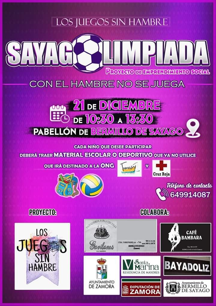 La actividad propuesta para el día 21 de diciembre tendrá lugar en el pabellón de Bermillo de Sayago consistirá en una jornada de juegos desde las 10.30 hasta la 13.30. Esta actividad se realizará por las alumnas del CIFP “Ciudad de Zamora” como proyecto de emprendimiento social colaborando con Tumaini y Cruz Roja.