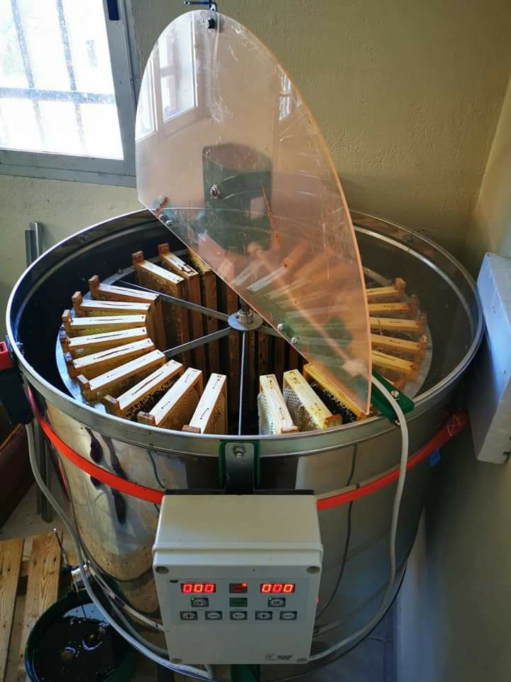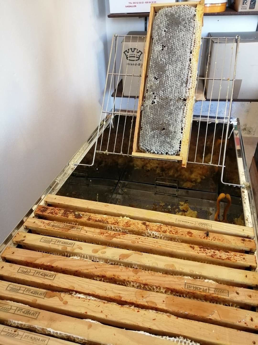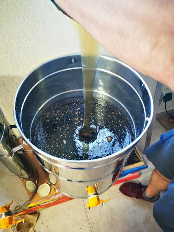 La miel extraída y filtrada, esta vez más oscura y con predominio de flor de zarzamora, descansa en el almacén para decantarse, en unos días estará lista para envasar.