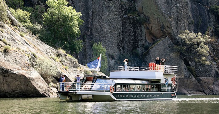 En la frontera entre Zamora y Portugal, a pocos metros de la presa de Miranda, los turistas y visitantes pueden surcar las aguas del Duero embalsado a bordo del barco ecológico de la empresa Europarques. El recorrido se ameniza con las explicaciones de guías y un audio que va detallando los recursos de la zona. Así, en los distintos puntos se pueden ver cultivos en bancales, avistar cigüeñas negras, visitar “El pozo de las nutrias“, casetos de piedra y, como no, conocer la belleza natural de las enormes paredes de piedra del Arribe. Durante los fines de semana, puentes y el mes de agosto tiene 2 salidas fijas a las 12 de la mañana y las 17 horas (una hora menos en Portugal).