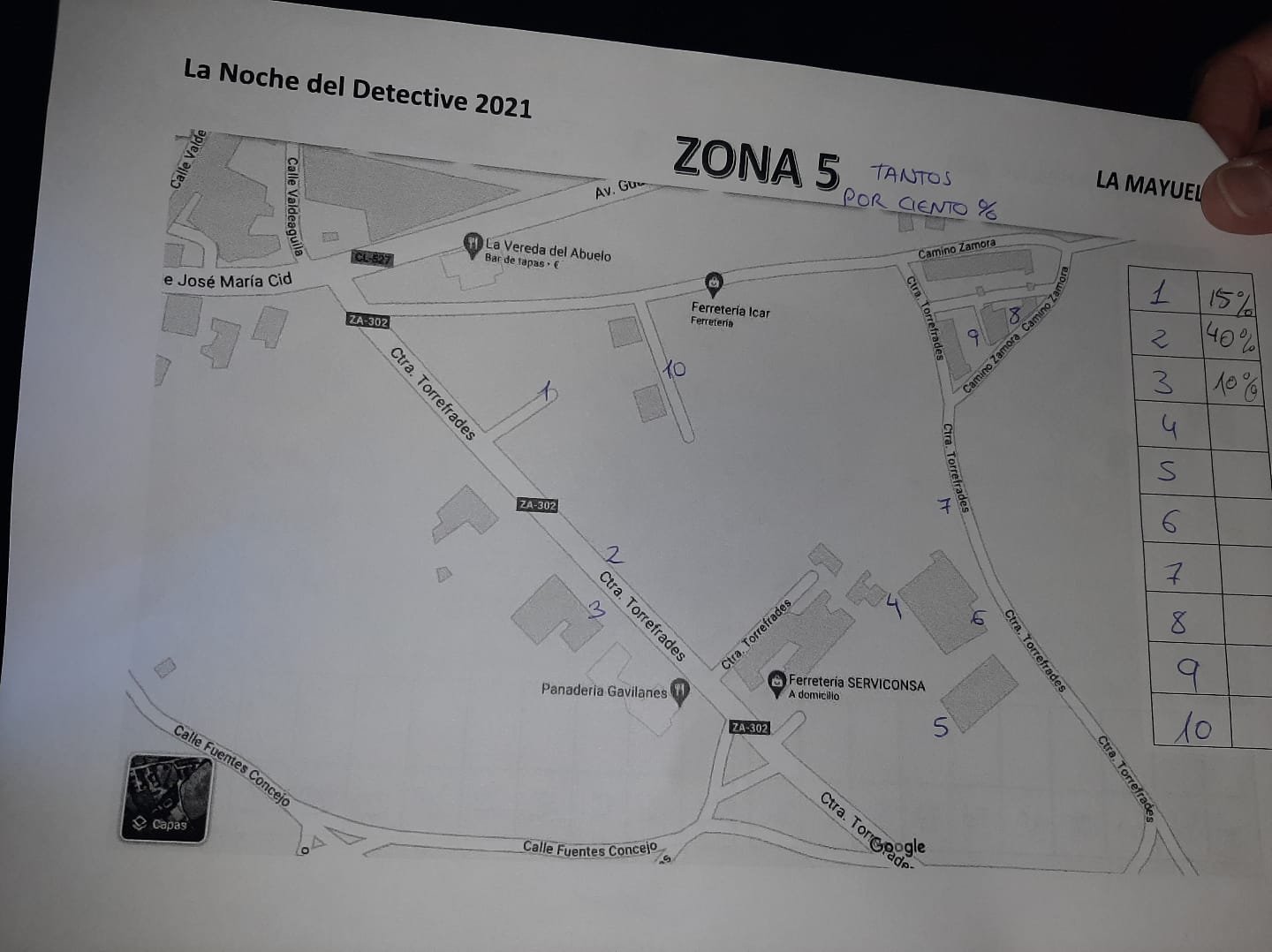Se esconden pistas por el pueblo, y en grupos con la linterna, tienen que ir con el mapa que se les entrega, buscándolas…. El que más pistas encuentre gana…
