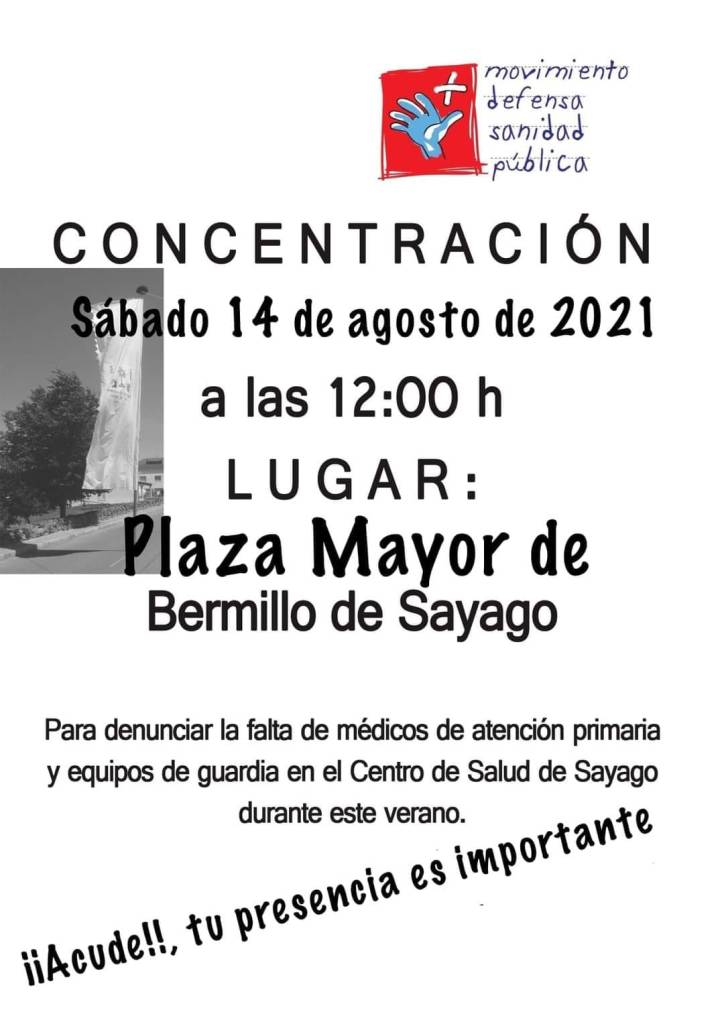 El Movimiento en Defensa de la Sanidad Pública, asociaciones y varios ayuntamientos de la zona de Sayago convocan a todos los vecinos y veraneantes a una concentración para denunciar la falta de médicos de atención primaria y equipos de guardia en el Centro de Salud Sayago del que dependen más de 50 localidades de la comarca. Debido a las vacaciones de varios profesionales sanitarios y algunas plazas no cubiertas, durante estos días, precisamente cuando la población se triplica en muchos pueblos, tan sólo contamos con un médico para atender a todo el territorio. Por esta razón, el movimiento anima a acudir de manera masiva (respetando siempre las medidas sanitarias)