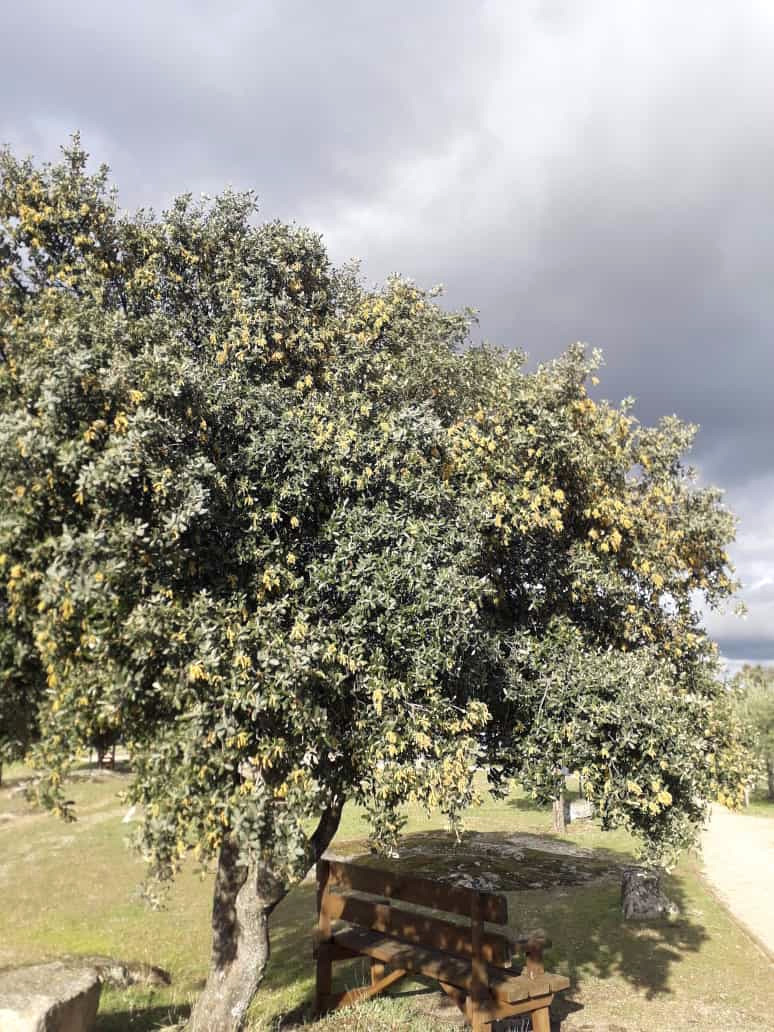 Junto a la peñica el cura, un estupendo ejemplar de Quercus Ilex, luce florido como si de la primavera se tratara