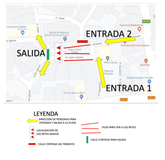 El Ayuntamiento ha publicado un escrito con las instrucciones a seguir. Los Reyes estarán en la antigua plaza de Calvo Sotelo (desde 2012, plaza de Agustín Carrascal…) y se formarán tres filas con padres, madres y niños que pasarán a recoger sus regalos entrando por la Plaza de Requejo y la Calle Almaraz. Una vez los recojan saldrán por la calle Vega y calle Iglesia.