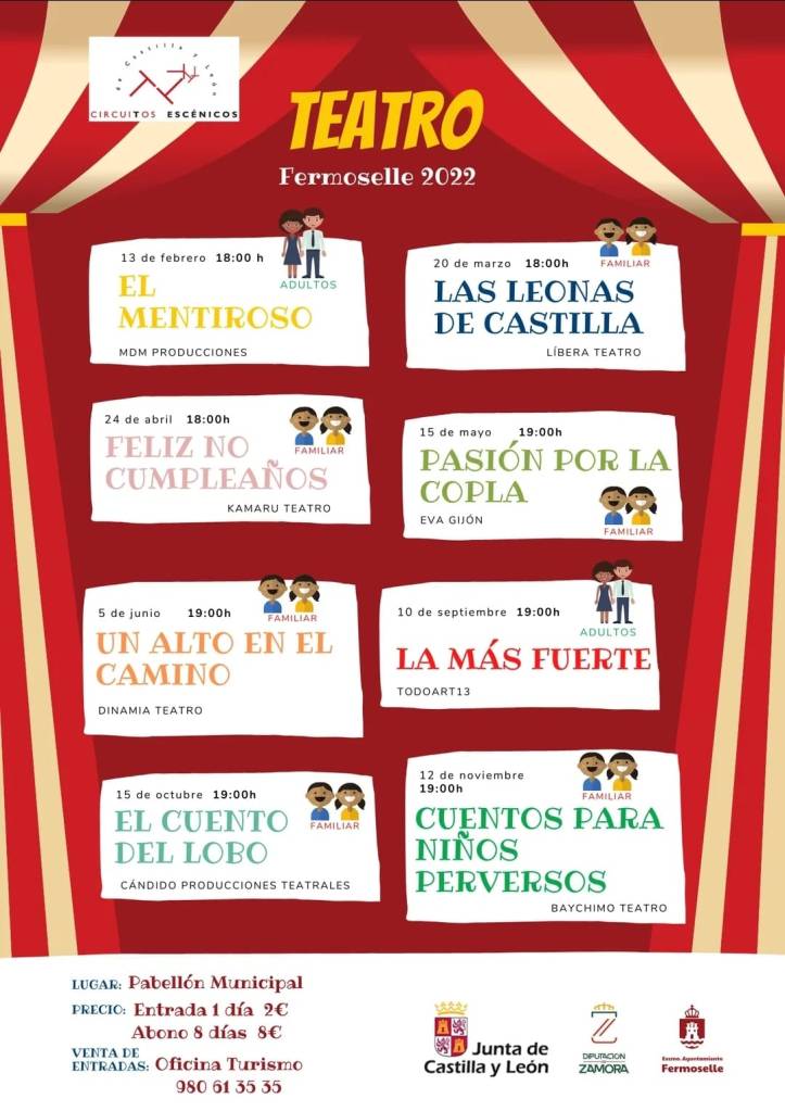 Así, entre Febrero y Noviembre, la villa fermosellana recibirá obras de teatros para niños y mayores así como actuaciones de copla. Puedes comprar el bono para todas las actuaciones (8€) o las entradas individuales para cada actuación (2€), la primera actuación será este sábado con «El Mentiroso» de MDM Producciones