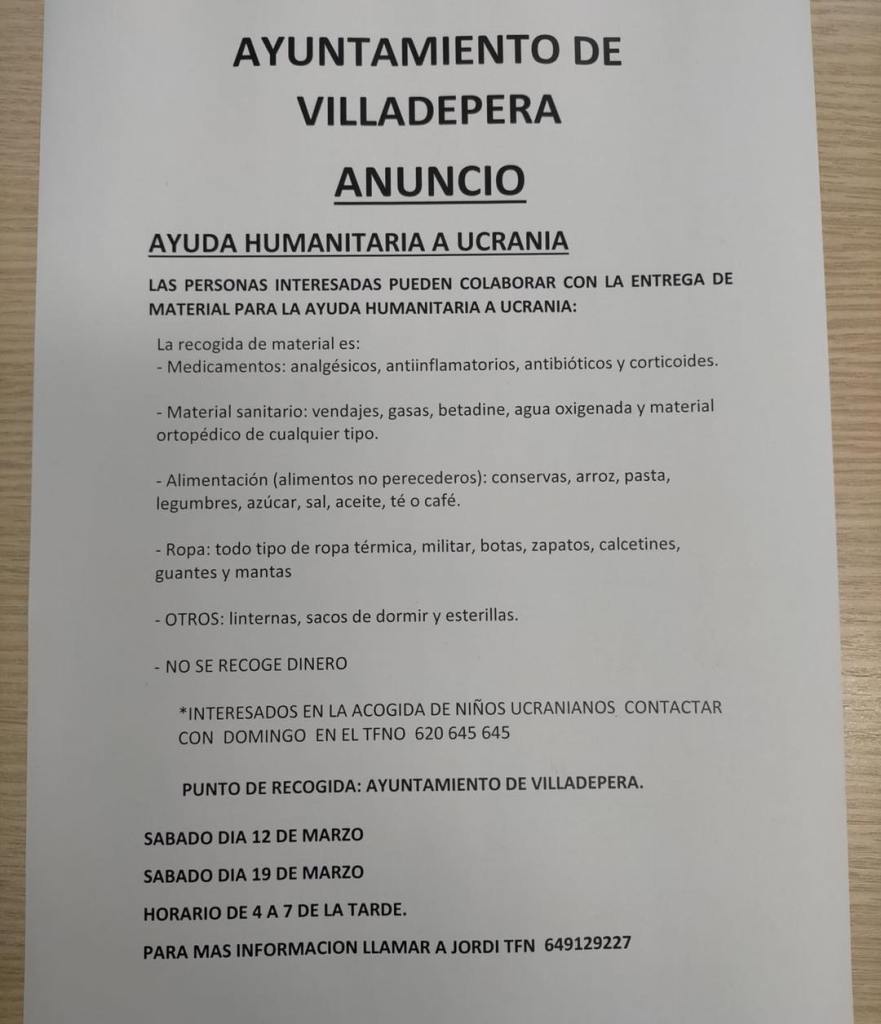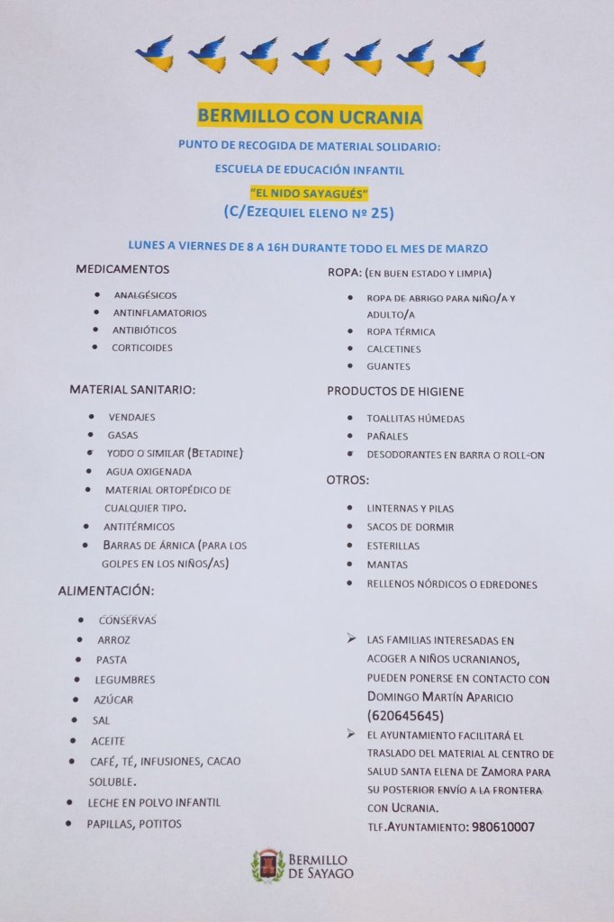 El Restaurante España (Fermoselle), El Abuelo en Carbellino, la Escuela Infantil «El Nido Sayagués», Manuel Santos en Luelmo, Ayuntamiento de Villadepera y el Ayuntamiento de Almeida (a iniciativa de Esther Santiago) se ofrecen como puntos de recogida de material necesario para afrontar la situación de emergencia humanitaria. Los productos se transportarán al Centro de Salud Santa Elena de Zamora capital para ser llevados a la zona de crisis. Se necesitan medicamentos, alimentos no perecederos, ropa térmica, óptica y linternas y sacos de dormir y esterillas para afrontar las bajas temperaturas. En esta lista iremos incorporando los negocios, particulares e instituciones que se vayan adhiriendo a esta iniciativa