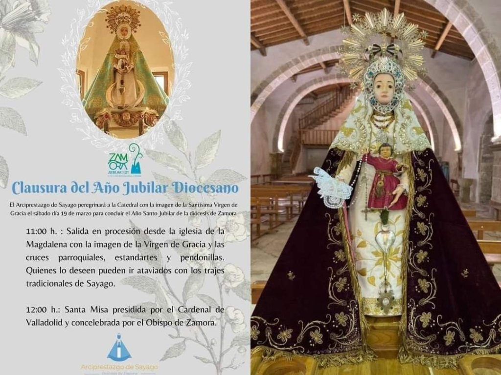 Será hoy sábado a las 11 horas desde la iglesia de la Magdalena. Junto a la Virgen de Gracia desfilarán fieles portando cruces parroquiales, estandartes y pendonillas. Muchos de los fieles irán ataviados con trajes típicos de la comarca. Finalizada la procesión se celebrará una misa a las 12 en la Catedral de Zamora
