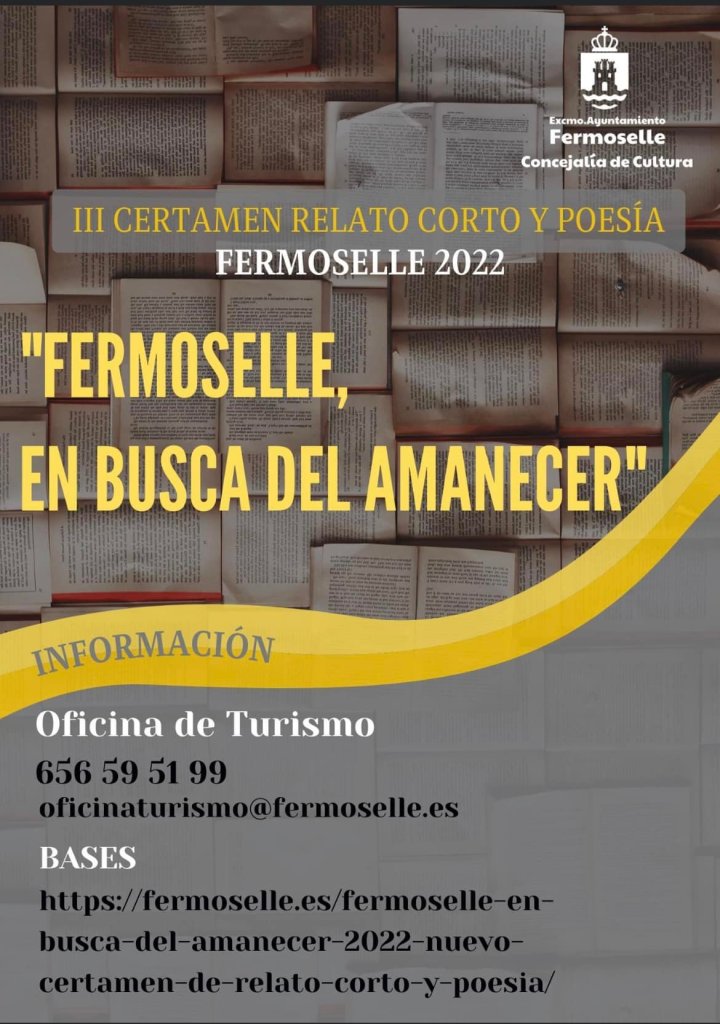 02.06.202203.08.2022 pueblosdesayago Fermoselle: Tercera edición del Certamen de Relato Corto y Poesía El Ayuntamiento organiza el III Certamen «Fermoselle en busca del amanecer». Tienes hasta el 10 de julio para presentar tu texto corto o poema. Más información y bases aquí Fuente: Ayuntamiento de Fermoselle «Fermoselle en busca del amanecer – 2022», nuevo certamen de relato corto y poesía Consultar bases en HTML y PDF Tu voto:Comparte este artículo: Compartir en WhatsApp (Se abre en una ventana nueva) WhatsApp Compartir en X (Se abre en una ventana nueva) X Comparte en Facebook (Se abre en una ventana nueva) Facebook Compartir en Threads (Se abre en una ventana nueva) Threads Haz clic en Pinterest (Se abre en una ventana nueva) Pinterest Compartir en Telegram (Se abre en una ventana nueva) Telegram Compartir en LinkedIn (Se abre en una ventana nueva) LinkedIn Enviar un enlace a un amigo por correo electrónico (Se abre en una ventana nueva) Correo electrónico Más Compartir en Reddit (Se abre en una ventana nueva) Reddit Compartir en Tumblr (Se abre en una ventana nueva) Tumblr Me gusta Cargando... Relacionado