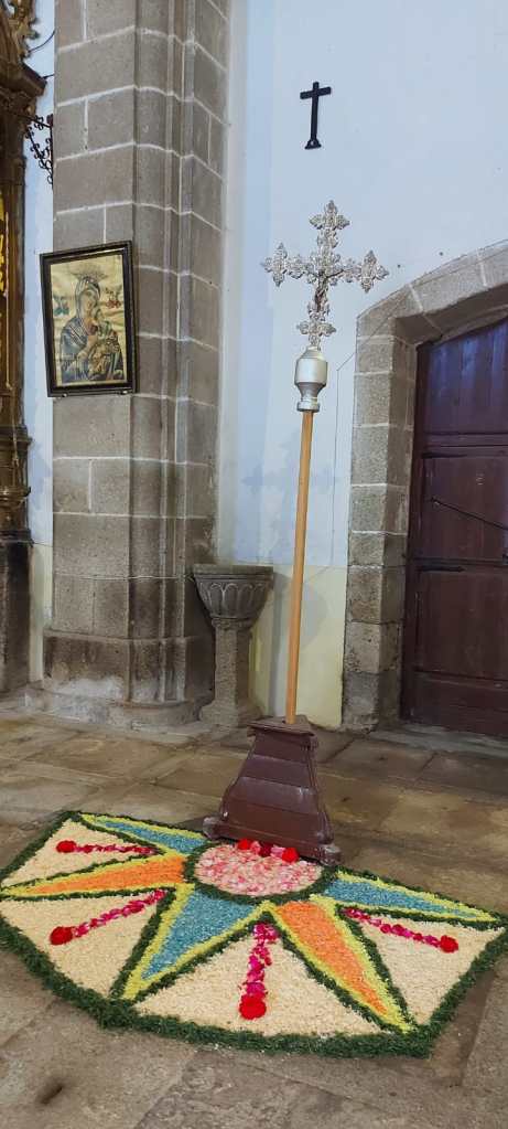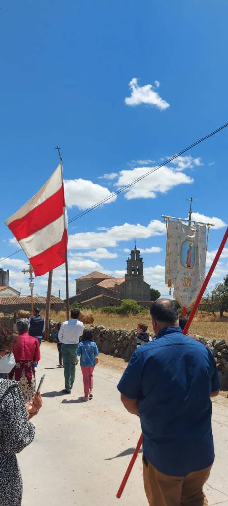 Alfombra floral en la iglesia de San Miguel de GánameAlfombra floral a la entrada de la iglesia de San Miguel de GánameRegreso de la procesión por las calles de la localidadProcesionando los pendonesOración frente al altar
