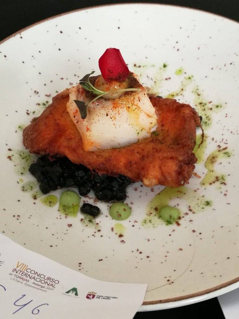 Con su Torrija de ajo arriero sobre calamares en su tinta, bacalao confitado, cremoso de guisantes y emulsión de ajos obtuvo el segundo premio. Plato ejecutado por Roberto Blanco, segundo de cocina. Con ingredientes de la gastronomía zamorana como la harina tradicional y aceite de los Arribes