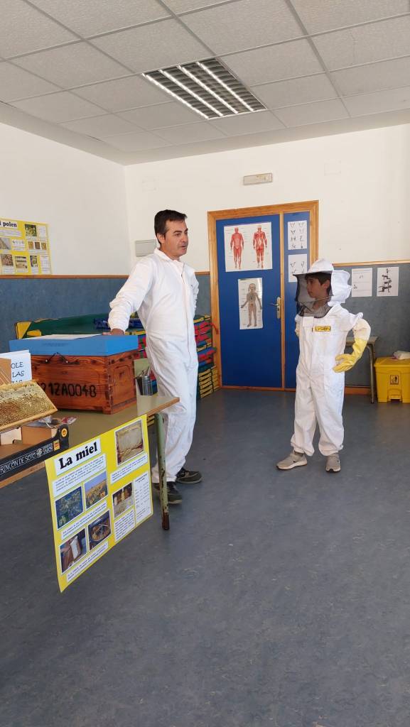 Tras varios años de parón por la pandemia. En Mayo han retomado el proyecto «Al cole con las abejas«, consistente en la realización de talleres y actividades encaminados en dar a conocer este fascinante mundo. Asi, ataviado con un traje de apicultor explica el día a día en el bosque, el cuidado que se debe tener en el manejo de las colmenas, los panales, cómo se extrae la miel y las aplicaciones que tiene tanto para alimentación como para cosmética.