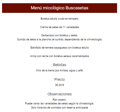 Del 28 de octubre al 12 de noviembre de 2023 los amantes de las setas podrán disfrutar de recetas especiales en los restaurantes adheridos. En la comarca de Sayago, el Restaurante Bar España de Fermoselle y Restaurante Los Arribes de Moralina.