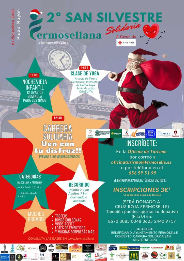 El Ayuntamiento de Fermoselle ha abierto una “Fila 0” en la Caja Rural, para que cualquier persona, participe o no en la carrera, pueda colaborar con su donativo. En el concepto se deberá indicar “Fila 0 Carrera Solidaria San Silvestre Fermosellana 2023”.