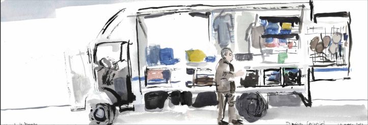 Contaba las hazañas del vendedor ambulante como si contara los viajes de Gulliver, daba señal precisa de los casos con una precisión y un detalle enciclopédicos, vienen en mi mochila ya, para siempre la invención de las rebajas, las aventuras del mulo y los tratos «de puertas para dentro» para que el comprar y el vender queden libres de envidias y murmuraciones.