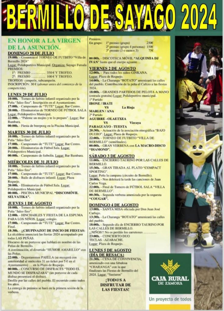 18:30 horas – ¡Chupinazo! de inicio de fiestas. La alcaldesa anunciará las fiestas 2024 acompañada de todas las peñas. Discurso de un portavoz que hablara en nombre de todas las peñas de Bermillo. A continuación, un divertido Humor Amarillo.