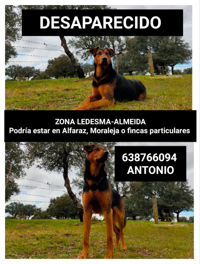 Nos escribe Antonio: se me perdió ayer en el campo, entre Ledesma y Almeida de Sayago, por si podéis difundir!! Está identificado y es muy sociable con las personas. Cruce de pastor alemán y rottweiler. Llamar al teléfono del cartel