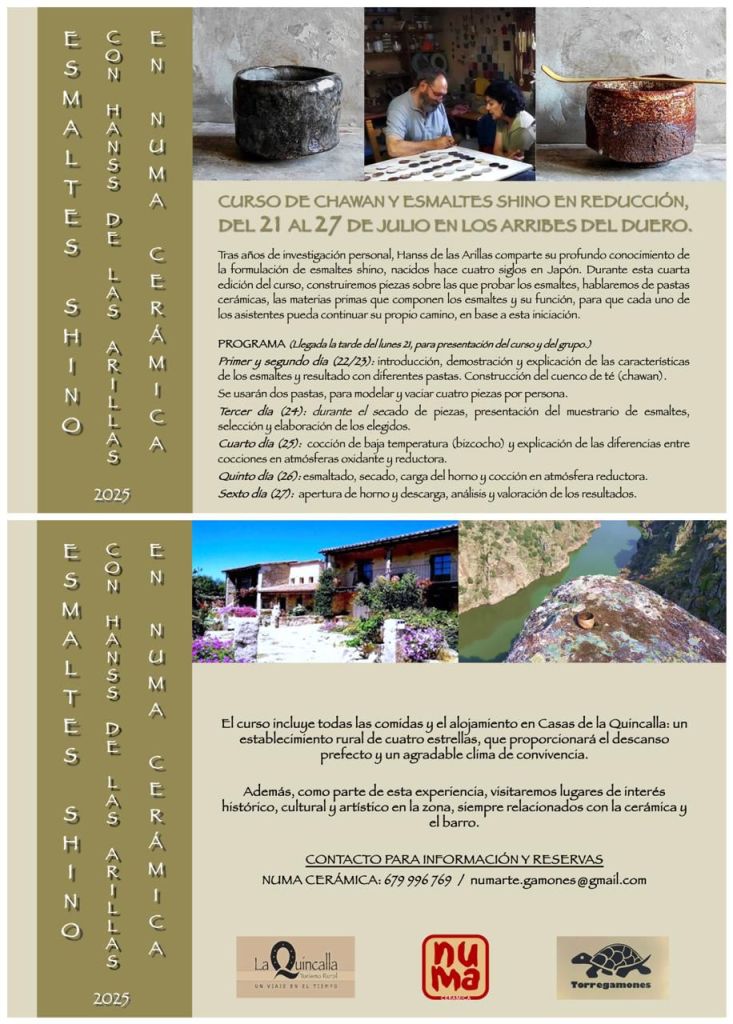 Durante seis intensos días de trabajo, mañana y tarde, los participantes se adentrarán en la creación de chawan (cuencos de té) y en la formulación de esmaltes Shino en reducción, bajo la guía del maestro Hanss de las Arillas. La experiencia se desarrollará en un entorno natural privilegiado de los Arribes del Duero, combinando el aprendizaje artístico con la convivencia en un ambiente familiar y acogedor.