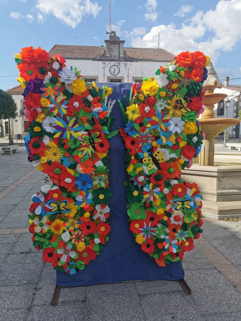 La mayoría de las flores las ha hecho Ramona, que a sus más de 90 años, no pierde oportunidad de echar una mano año tras año. El diseño de la mariposa para fotografiarse ha sido invención de Tere Araujo y Vale.