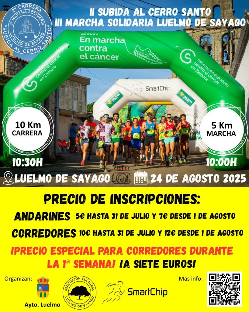 Desde la Asociación Cultural de Luelmo, nos comunican que ya están abiertas las inscripciones para participar en la II Subida al Cerro Santo y la III Marcha Solidaria de Luelmo de Sayago, que tendrán lugar el domingo 24 de agosto de 2025 en esta localidad zamorana. Un evento deportivo y solidario con el objetivo de recaudar fondos para la Asociación Española Contra el Cáncer (AECC) en Zamora.
