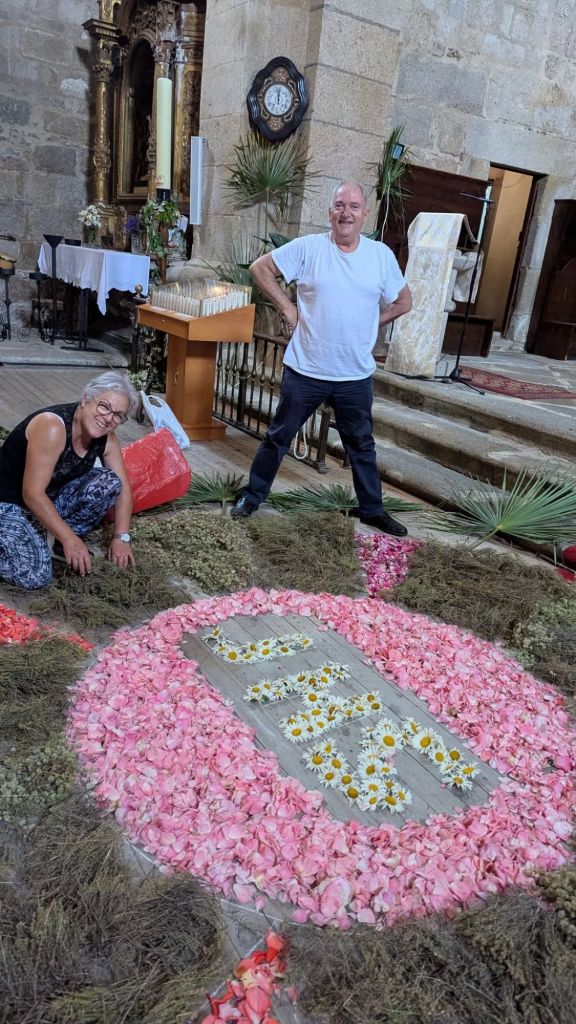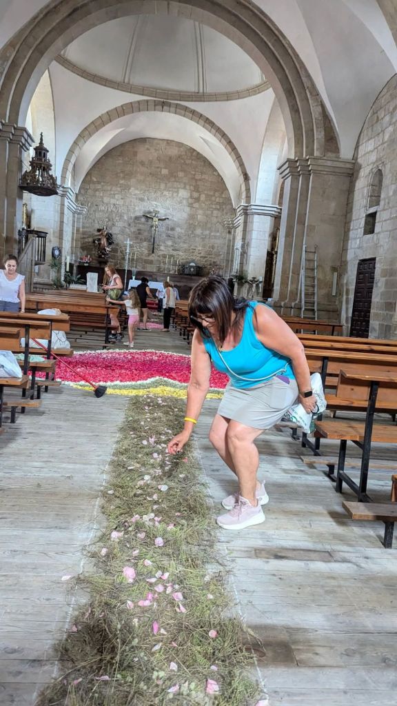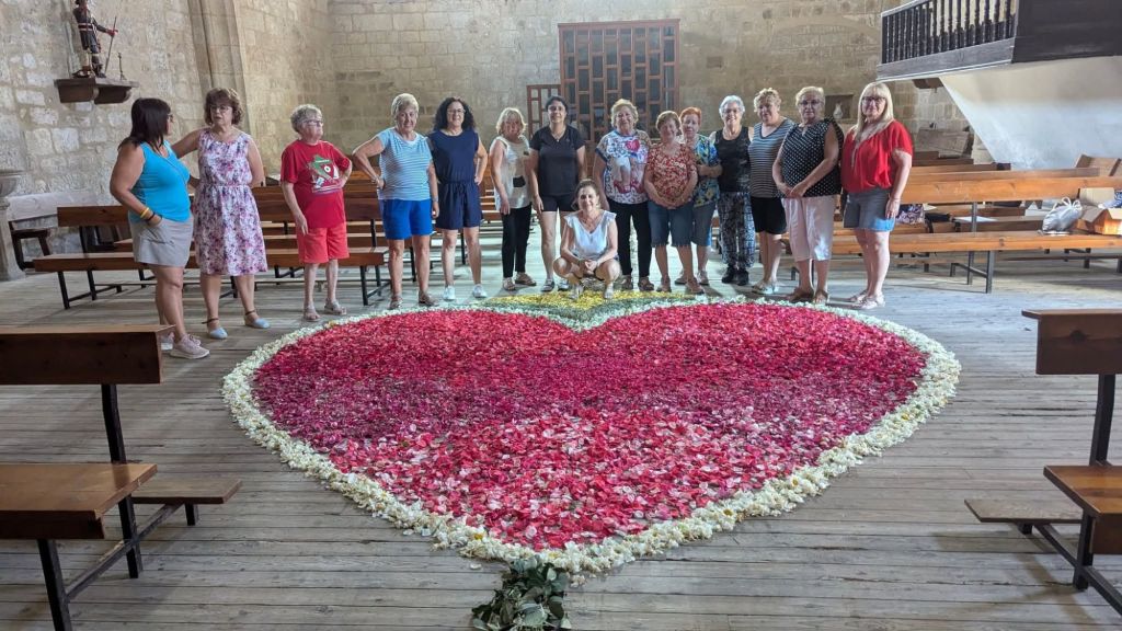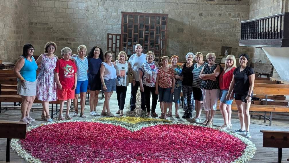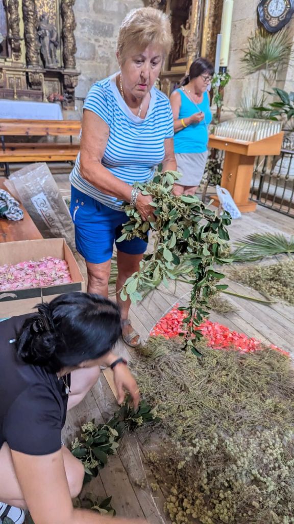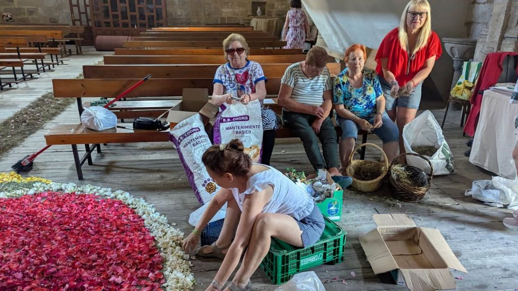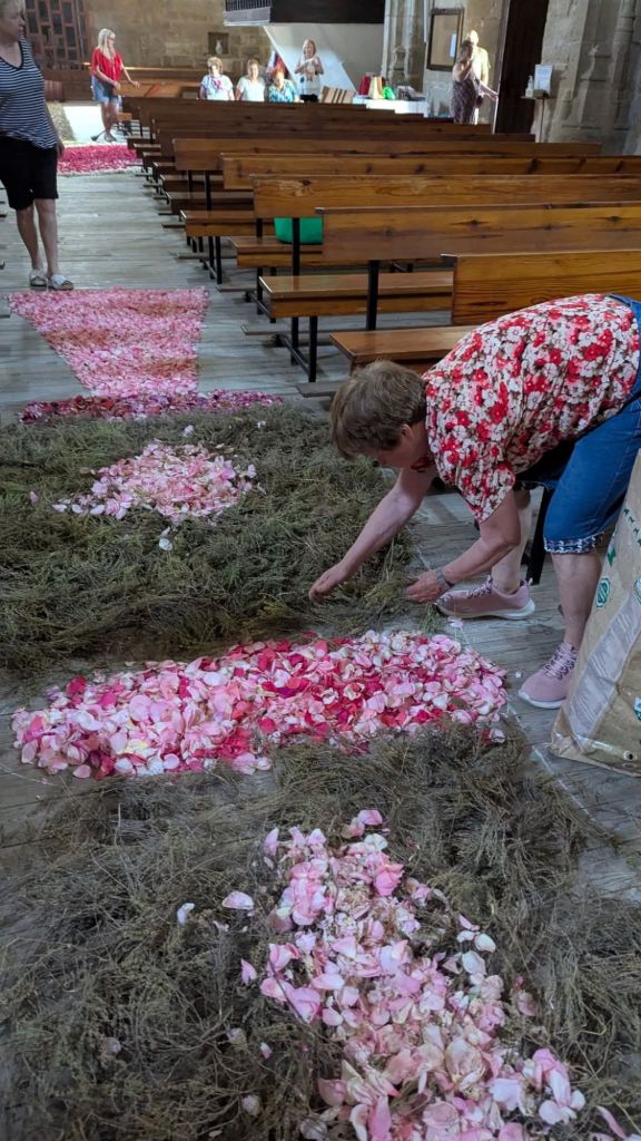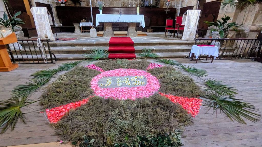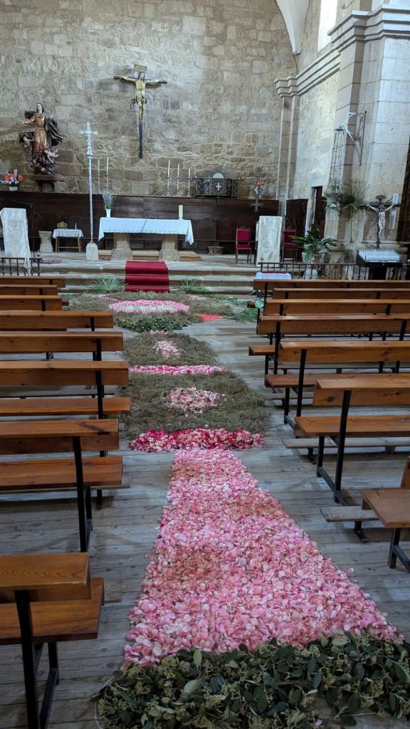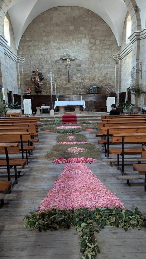 Un año más la Asociación de mujeres engalana la iglesia y la prepara para el día de Corpus Cristhi. Este año se compone de una representación del Sagrado Corazón de Jesús como un símbolo de su amor divino por la humanidad. El pasillo principal una gran custodia de pétalos de rosa , tomillo y alegría que porta la Sagrada Forma con un JHS.