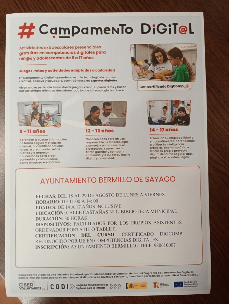 Del 18 al 29 de agosto, de lunes a viernes, la fundación CiberVoluntarios en colaboración con el ayuntamiento de Bermillo de Sayago organiza un Campamento Digital gratuito para niños, niñas y adolescentes de 9 a 17 años, con el objetivo de formarles en competencias digitales de forma creativa, segura y responsable.