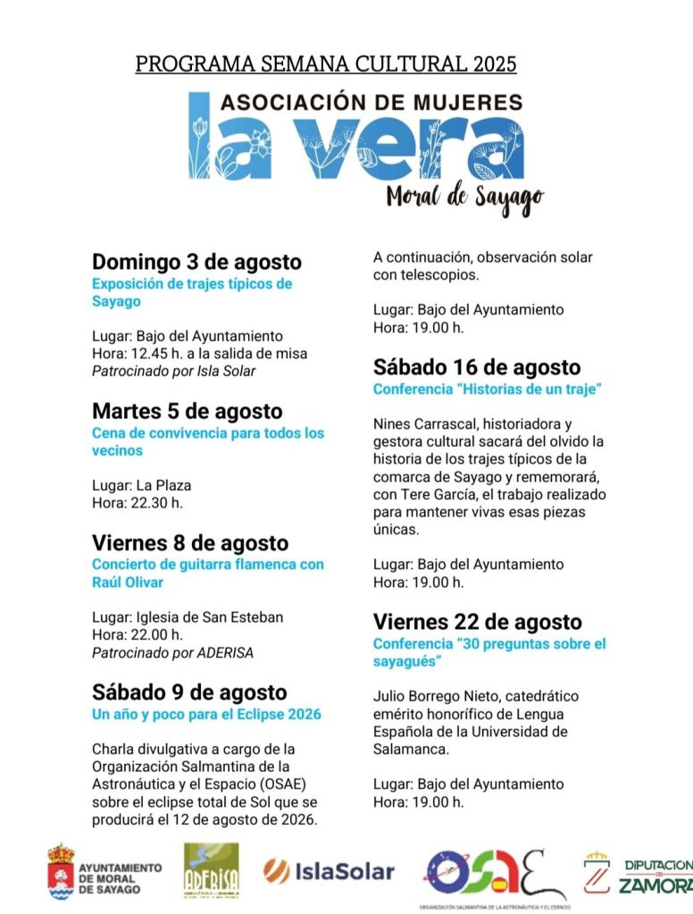 La Asociación de Mujeres «La Vera» de Moral de Sayago ha preparado una completa programación cultural para este mes de agosto de 2025, con actividades que combinan el saber popular, la divulgación científica, la música y la memoria del territorio.