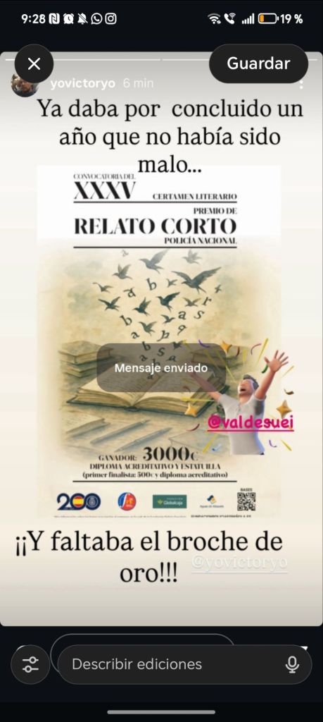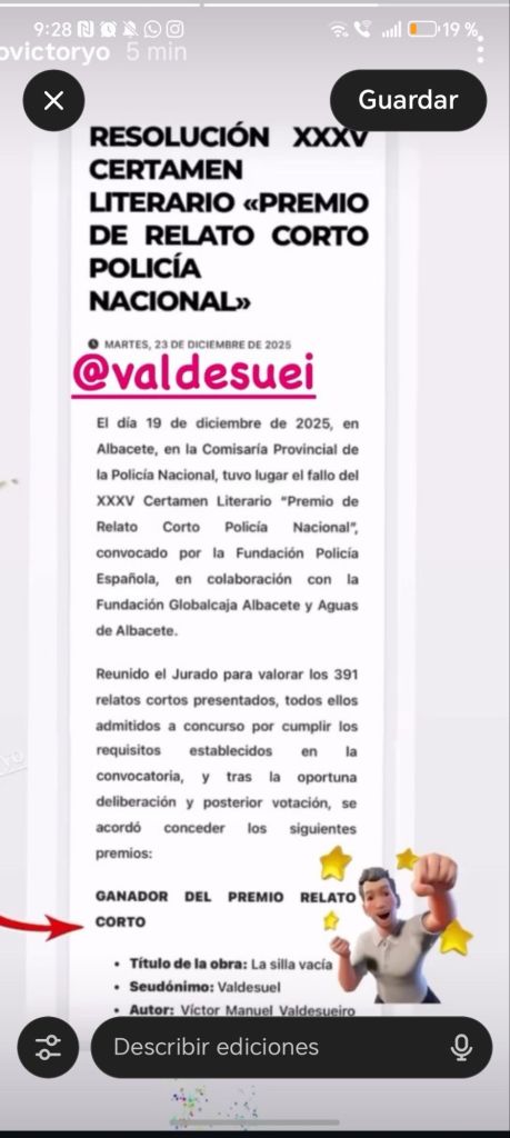 El escritor, conocido como @valdesuei, ha sido el ganador del XXXV Certamen Literario “Premio de Relato Corto Policía Nacional” con su obra La silla vacía, imponiéndose entre 391 relatos presentados de toda España.