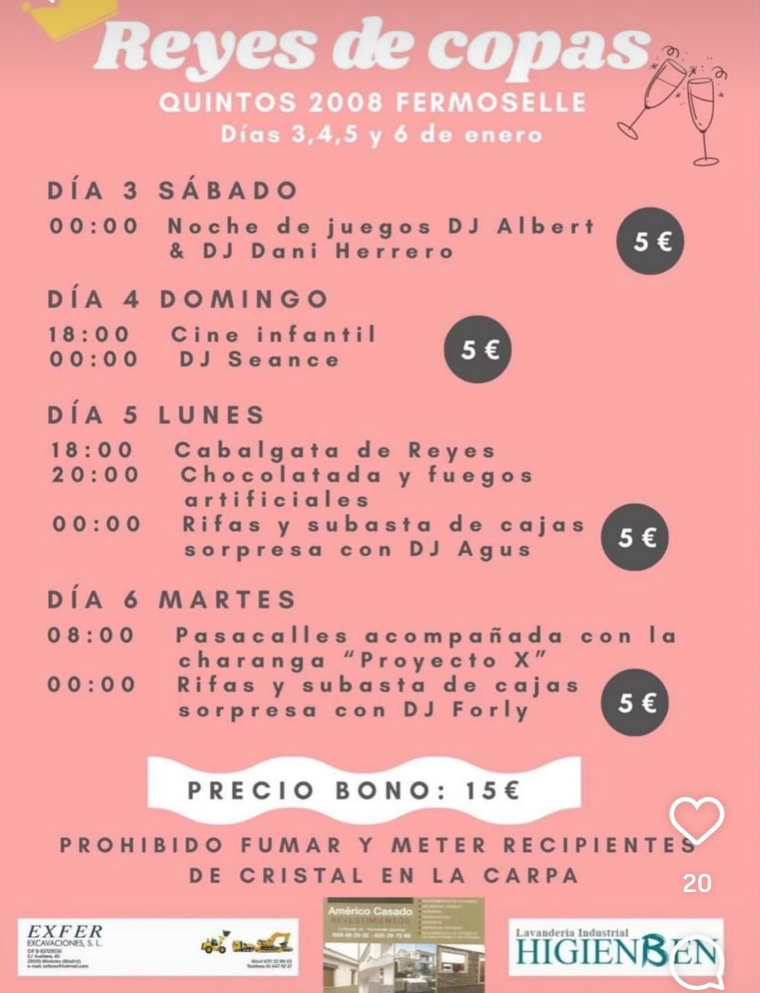 Los quintos 2008 de Fermoselle celebrarán sus fiestas del 3 al 6 con noches de juegos, cine infantil y dj, cabalgata, chocolatada y rifas y pasacalles con charanga para el día 6. Vivan los quintos!