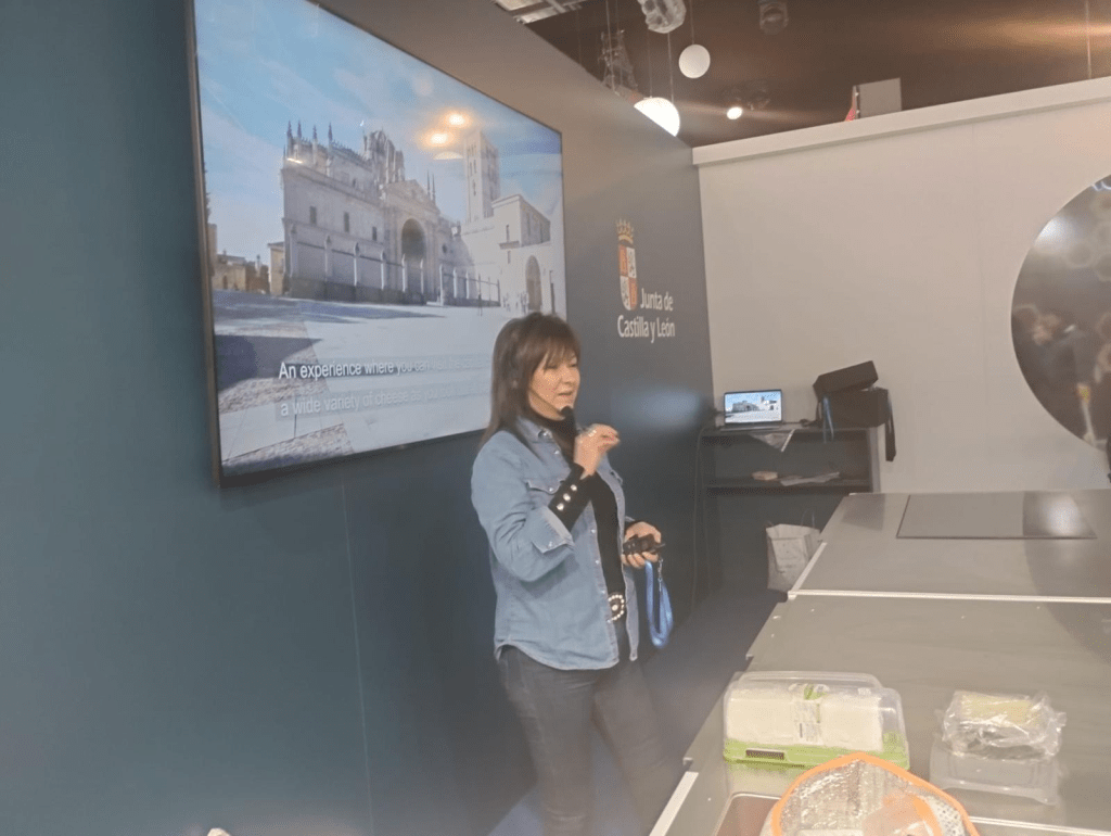 La gerente de Los 7 Sentidos, Belén Santos, dirigió el sábado 24 de enero una cata de quesos en la zona enogastronómica del Pabellón de Castilla y León durante FITUR, con motivo de la presentación de Fromago 2026.