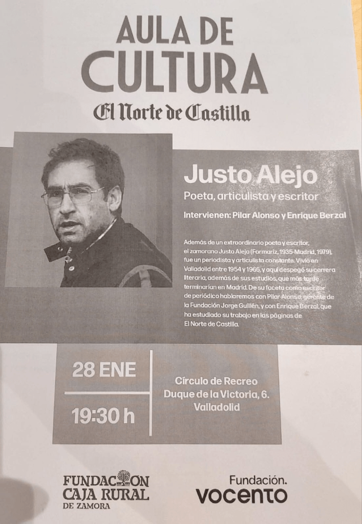El Aula de Cultura de El Norte de Castilla dedica una nueva sesión a la figura del poeta, articulista y escritor sayagués Justo Alejo, uno de los nombres más singulares de la literatura zamorana del siglo XX, con una destacada vinculación a la prensa y a la vida cultural de Valladolid.