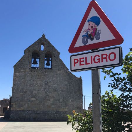 Peligro, niños jugando, la señal de tráfico que advierte de la presencia de pequeños junto a la iglesia de Villamor de la Ladre